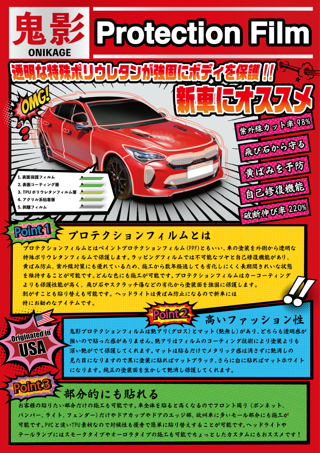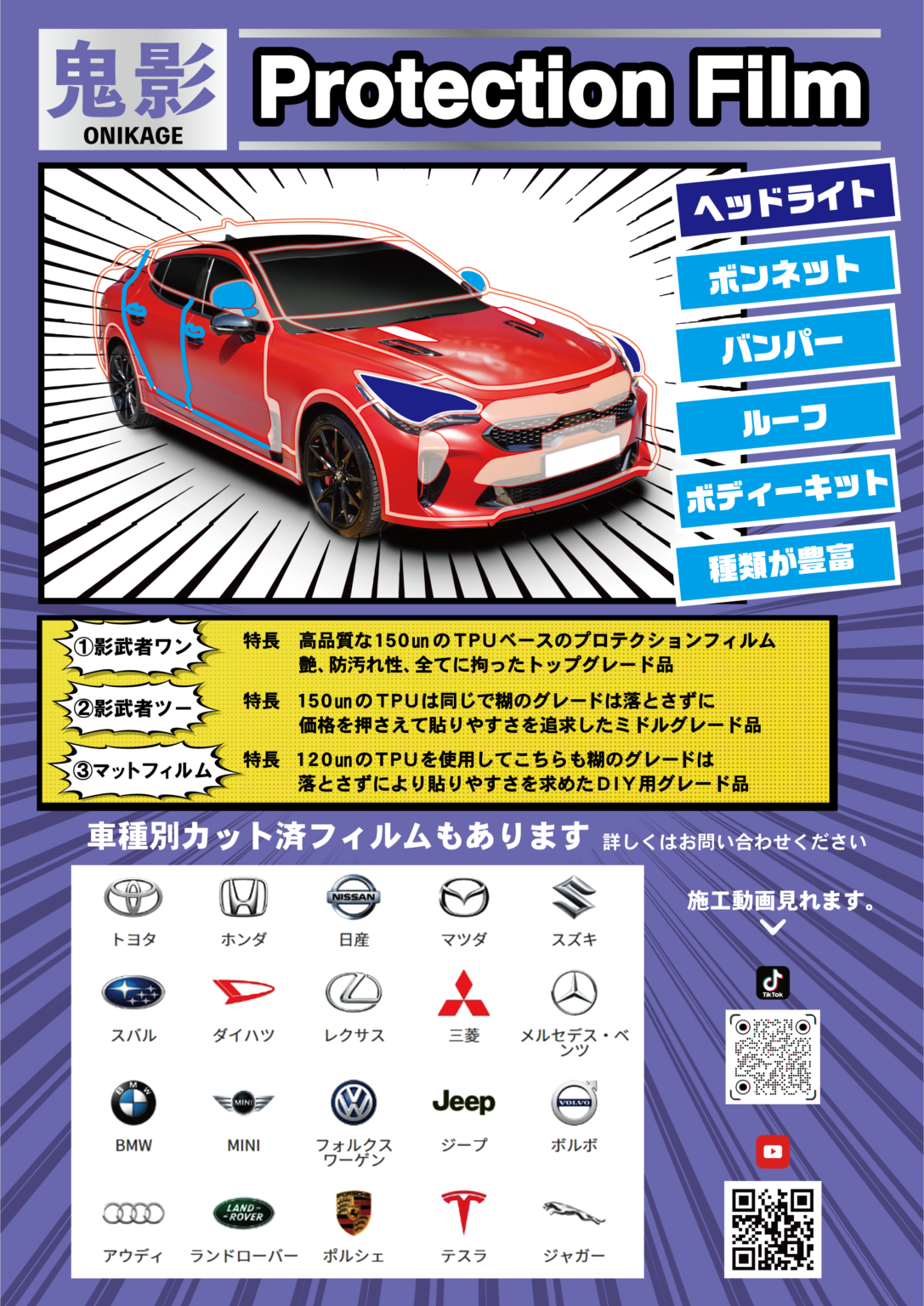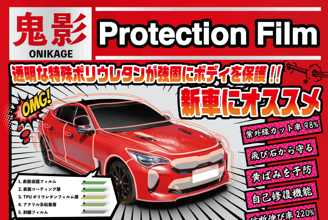 「HEXIS」「XPELJAPAN」の正規ディーラーとして、カーラッピング事業開始し、このたび海外メーカーと共同開発により、日本向けに最適化した「鬼影プロテクションフィルム」を開発いたしました。